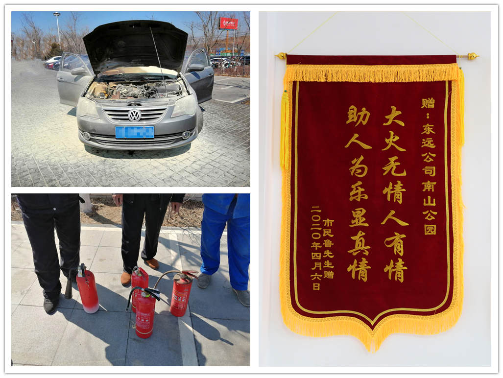 如果說陪伴是最長(zhǎng)情的告白,那么“守護(hù)平安”則是景區(qū)保安隊(duì)員最恒久的承諾。當(dāng)?shù)谝粫r(shí)間發(fā)現(xiàn)停車場(chǎng)內(nèi)游客停放的車有煙冒出時(shí),我們的保安隊(duì)員一邊打119報(bào)警,一邊迅速拿起滅火器跑到事發(fā)車輛前,不畏竄起的火苗在119到達(dá)之前將其撲滅。當(dāng)游客得知情況匆匆忙忙跑下山看到眼前的一幕,緊緊的拉住保安隊(duì)員們的手連聲道著感謝,如果沒有及時(shí)給予處理不僅僅是自己車輛造成更嚴(yán)重的損失,也會(huì)給這滿山都是草木的南山公園造成不可估量的后果。事后游客送來錦旗表達(dá)感激之情。