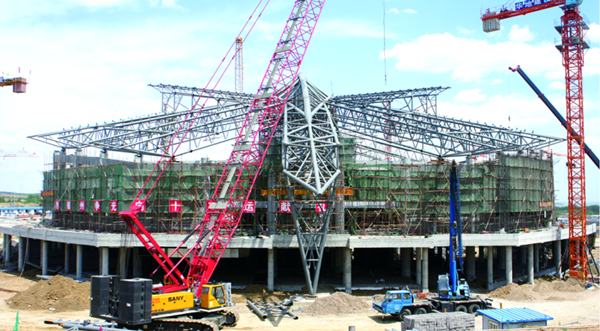 濱海體育中心建設是錦州全市人民的矚目工程,是向省政府承諾承辦2013年第十二屆全國體育運動會羽毛球比賽的重點工程。工程結構形式較為特殊,鋼結構總量4800多噸,施工過程中存在多個專業(yè)的交叉施工,受到場地條件、垂直運輸?shù)闹萍s,對整個工程的安全管理要求很高。工程有幾個特點,一是體量比較大,體育場建筑面積有62300平方米,二是工程復雜,屋面的網(wǎng)架大跨度253米,拱高75米,在我國也是個比較大的體育場工程,另外拱腳比較大,每個拱腳的土方量在1萬立方米。
